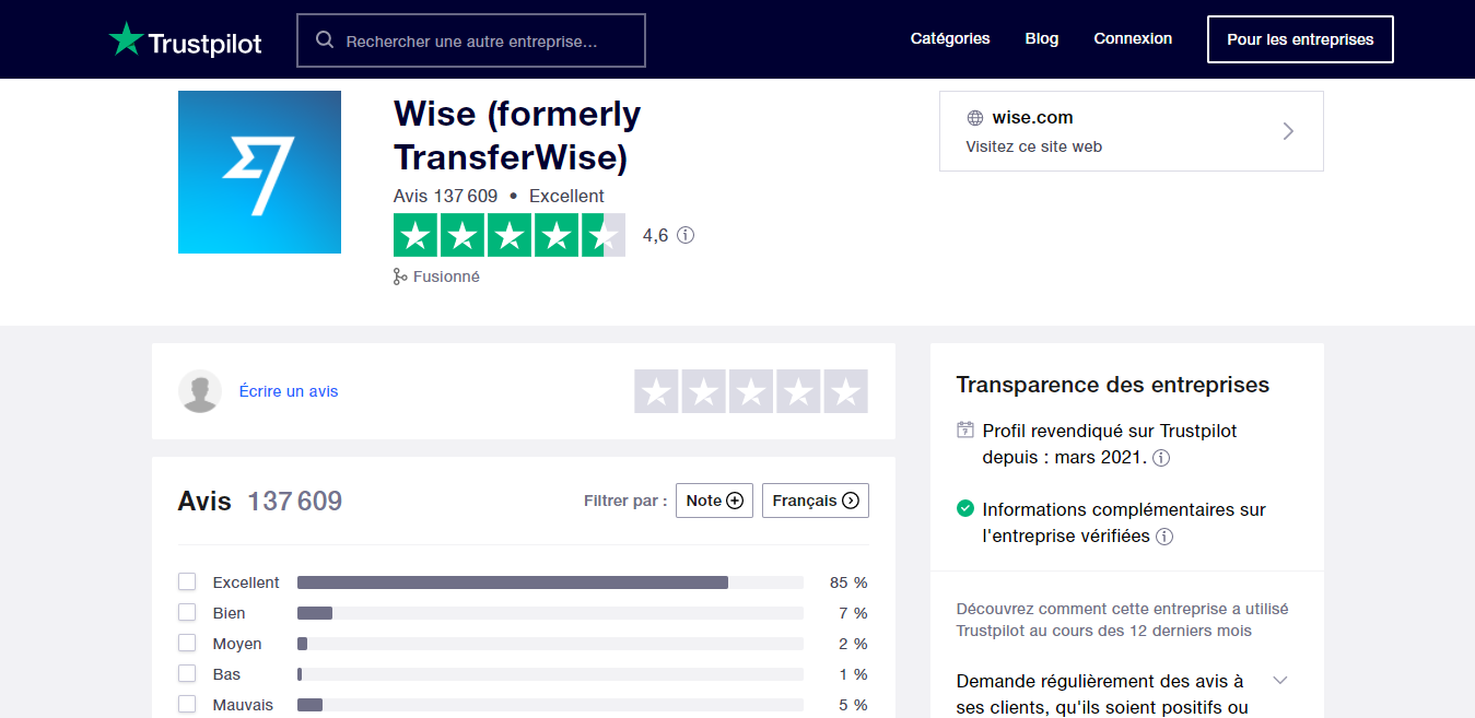 Avis TrustPilot sur Wise (anciennement TransferWise)